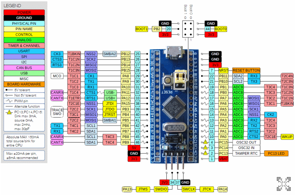 • Các chân của vi điều khiển cho phép dòng điện ra vào tối đa là 20mA, khuyến cáo không nên vượt quá 8mA, những chân có dấu chấm than  chỉ có thể sử dụng với dòng đi vào không quá 3mA (ví dụ như chân PC13-PC15)