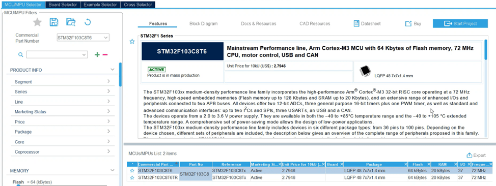 Sau đó các bạn chọn STM32F103C8T6x và nháy đúp chuột hoặc bấm vào NÚT Start Project để bắt đầu tạo ứng dụng.