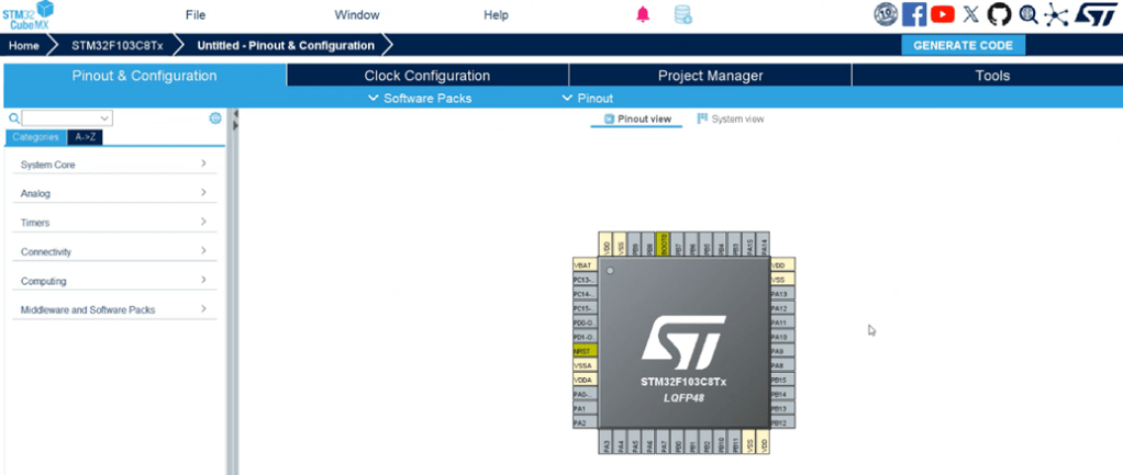 Tại đây phần mềm cho phép thiết lập cấu hình, các chân ra/vào và các ngoại vi cần thiết để thực hiện ứng dụng. Đầu tiên, chúng ta cần phải thiết lập tần số hoạt động của CPU, hay nói cách khác cần phải thiết lập xung nhịp (clock) cho vi điều khiển. Tần số xung nhịp của chip phản ánh tốc độ xử lý của CPU, nếu tần số càng cao thì CPU xử lý càng nhanh và ngược lại. Hiện tại thì STM đã có những dòng đạt tới tốc độ xử lý trên 600MHz nghĩa là trong 1s thì có hơn 600000000 phép xử lý. Đối với STM32F103C8T6 tần số Max là 72MHz. Như vậy, tùy vào yêu cầu của bài toán mà các bạn có thể chọn chip có tốc độ phù hợp.