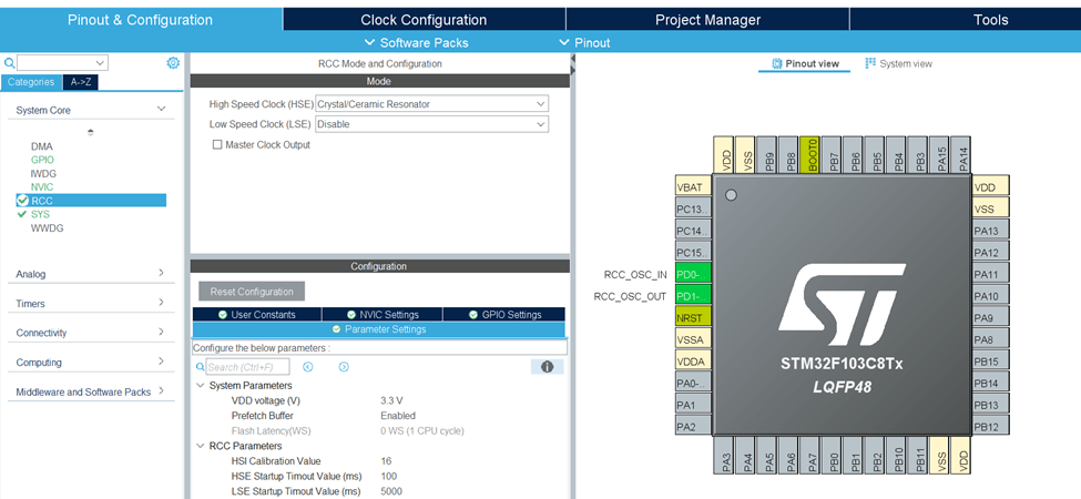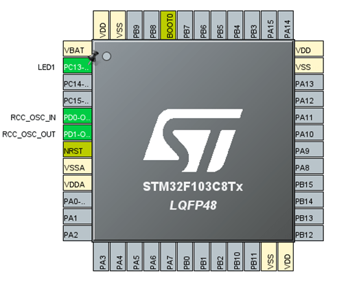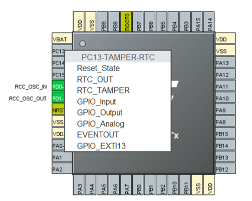 Như vậy với trường hợp Kit Blue Pill, chúng ta sẽ chọn Crystal/Ceramic Resonator. Sau khi chọn, ngay lập tức trên vi điều khiển sẽ xuất hiện hai chân RCC_OSC_IN (PD0) và RCC_OSC_OUT (PD1) được tô màu xanh lá cây. Đây cũng là hai chân đầu vào của thạch anh ngoài, trên mạch Kit Blue Pill đã được hàn sẵn nên chúng ta chỉ cần sử dụng mà thôi.