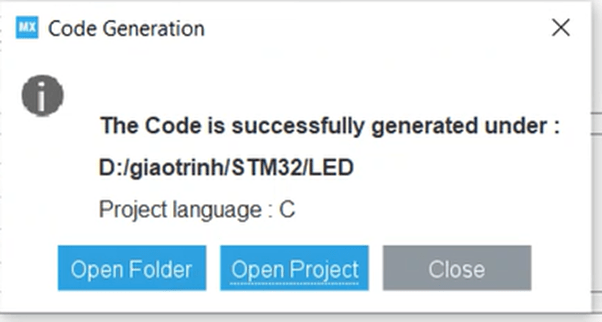 Sau khi phần mềm Generate code xong sẽ xuất hiện cửa sổ và cho phép chúng ta lựa chọn mở STM32CubeIDE