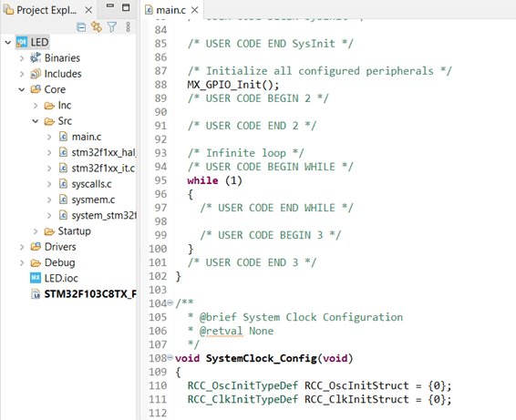 Trong file main.c. Các bạn kéo chuột xuống dưới đến hàm while