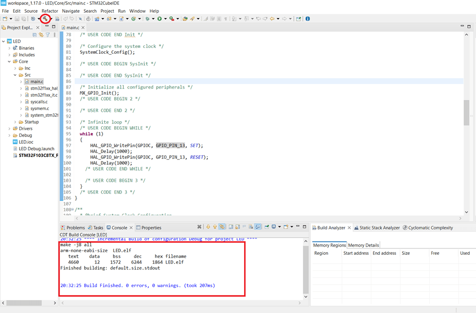 Sau khi hoàn thiện code, các bạn cần phải buil chương trình để tìm lỗi. Nhấn biểu tượng cái búa để buil chương trình, nếu có lỗi thì chương trình sẽ hiển thị, còn không có lỗi sẽ báo tin nhắn là “Finished building. 0 errors, 0 warnings”